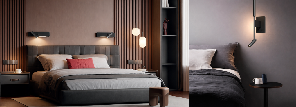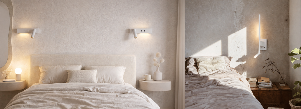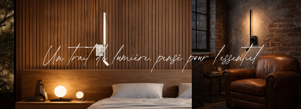 Deux écritures formelles distinctes, unies par une vision commune : associer une lumière d’ambiance douce à une liseuse orientable et précise, intégrée avec discrétion dans l’architecture du mur.