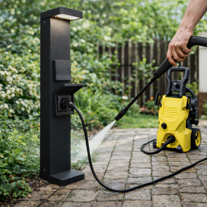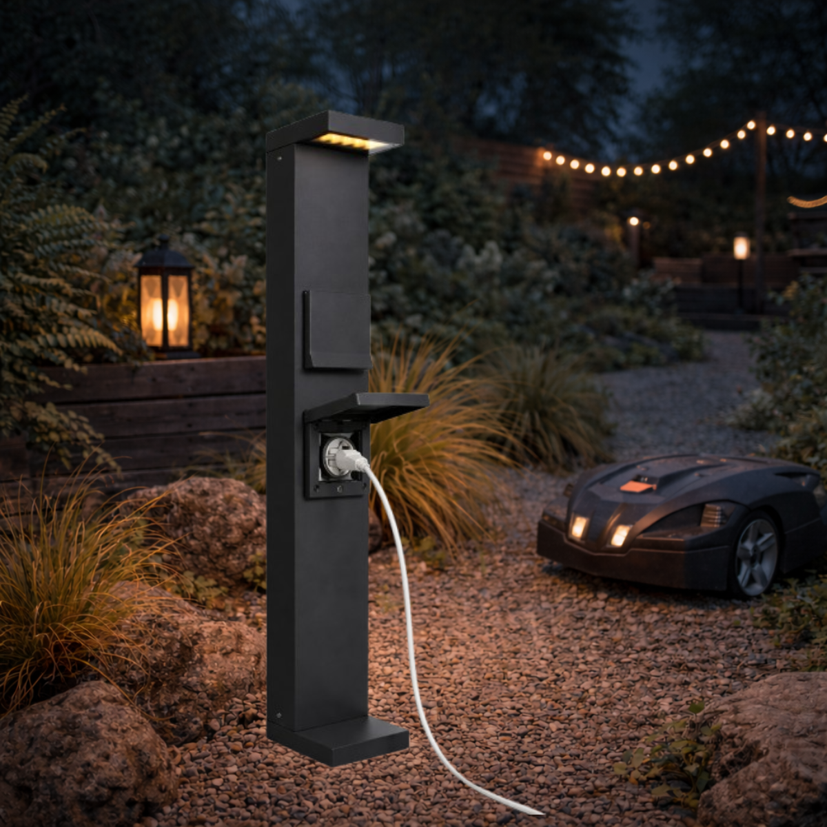 Dotée de deux prises SCHUKO intégrées (2 × 1000 W), protégées par des trappes discrètes, elle permet le raccordement sécurisé d’équipements extérieurs tels que robots de tonte, outils de jardinage, éclairages temporaires ou dispositifs de recharge occasionnelle. La partie supérieure diffuse une lumière douce et maîtrisée, idéale pour le balisage et la mise en valeur des cheminements, tout en assurant un confort visuel optimal.