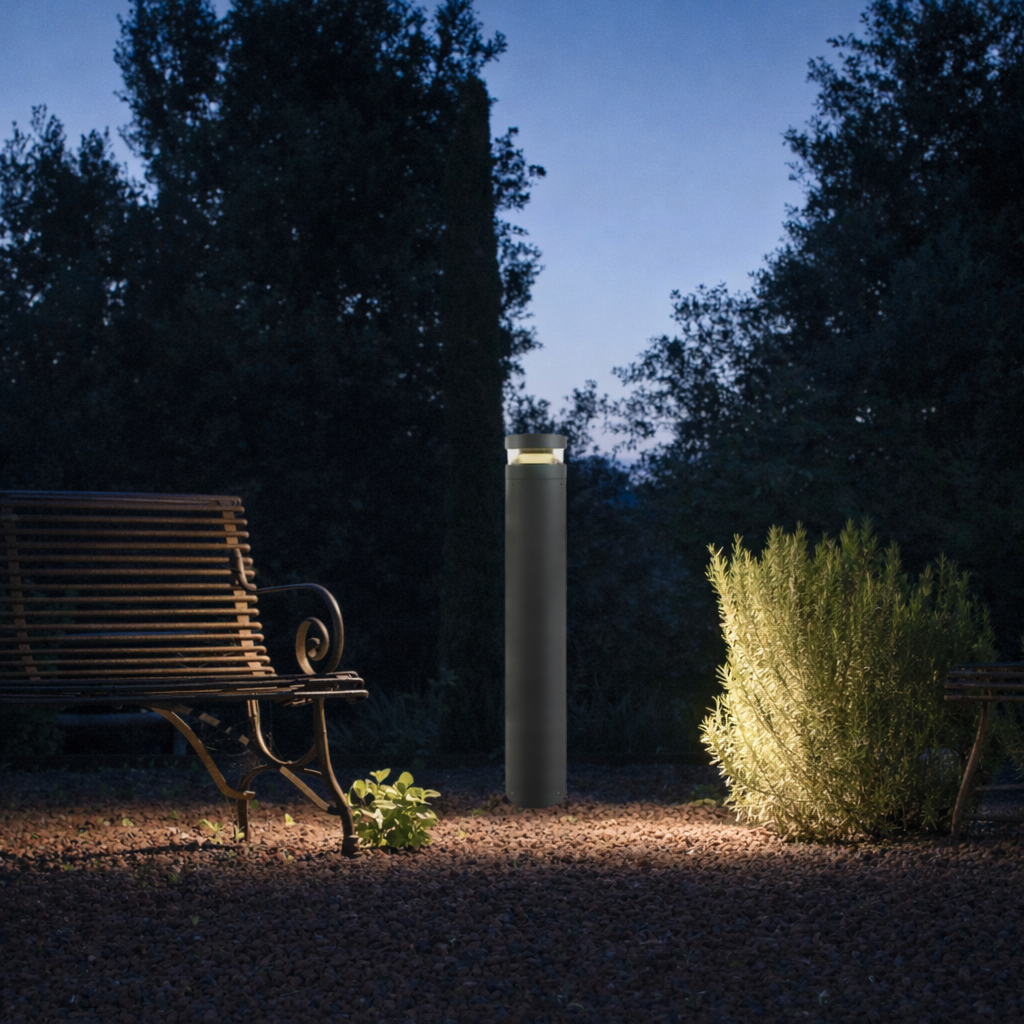 Élégantes et discrètes, les bornes lumineuses extérieures BORNÉO s’intègrent naturellement dans les jardins, allées, terrasses et abords de piscine.