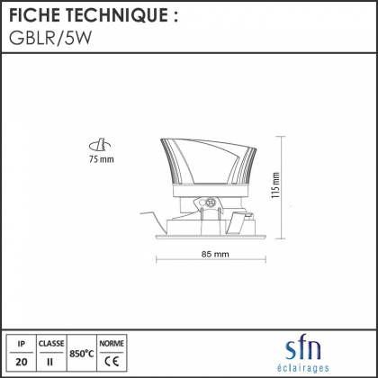 | Code | Désignation | Puissance Watts (W) | Orientable | T° couleur Kelvin (K) | Encastrement Ø (mm) | Hauteur (mm) | Recouvrement Ø (mm) | |