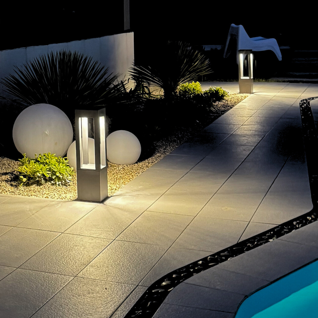 Avec sa silhouette carrée de 60 cm de hauteur, elle diffuse une lumière homogène à 360°, idéale pour structurer une terrasse, accompagner une allée ou mettre en valeur des massifs paysagers.