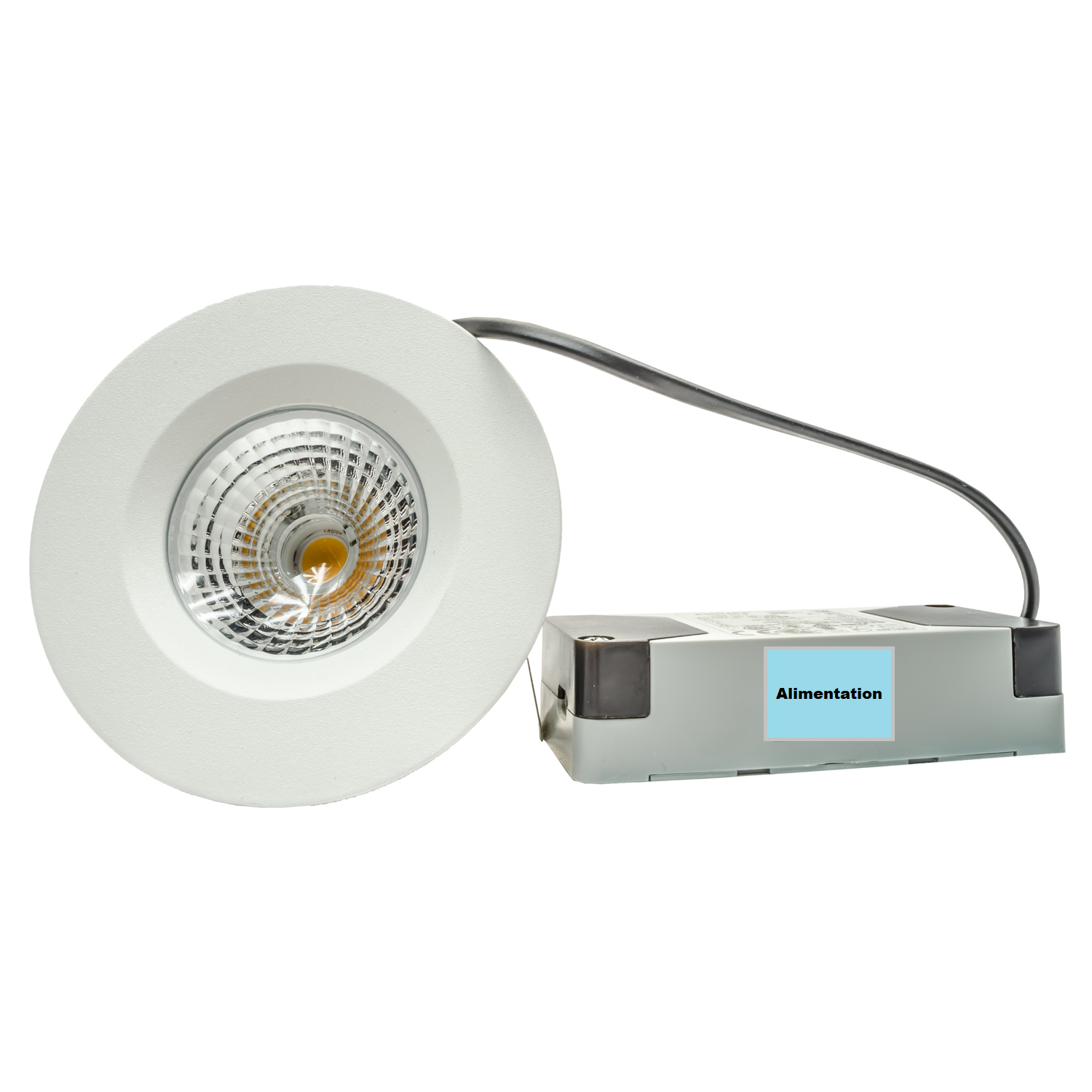 | Code | Désignation | Puissance Watts (W) | Orientable | T° couleur Kelvin (K) | Flux lumineux Lumens (lm) | Encastrement Ø (mm) | Hauteur (mm) | Recouvrement Ø (mm) | |