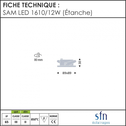 ELI-05161002 | SAM LED 1610/12W ÉTANCHE BLANC 3K | 12 | Non | 30000 | 779 | 80 | 38 | 89x89 |