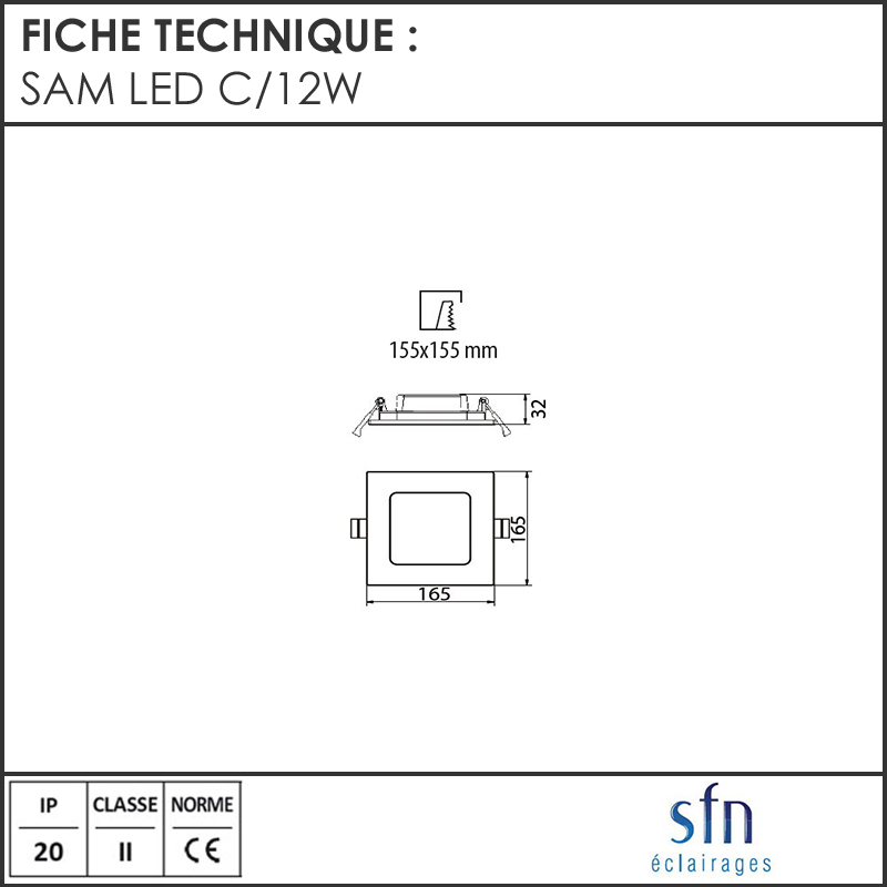 ELI-25155130 | SAM LED C DIM/12W BLANC 3K | 12 | Non | 3000 | 780 | 155x155 | 32 | 165x165 |