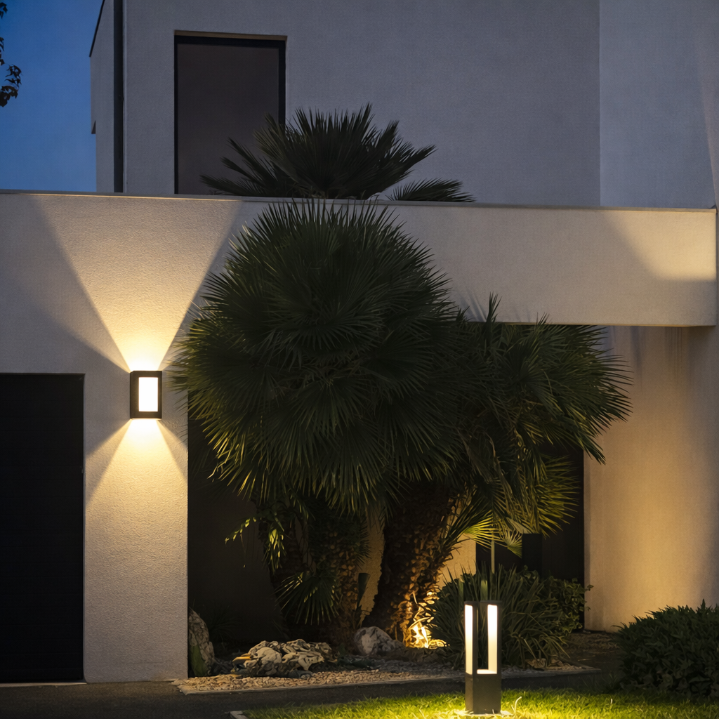 Plus qu’une applique murale, VERTEX au dessin géométrique affirmé sculpte la façade avec précision.